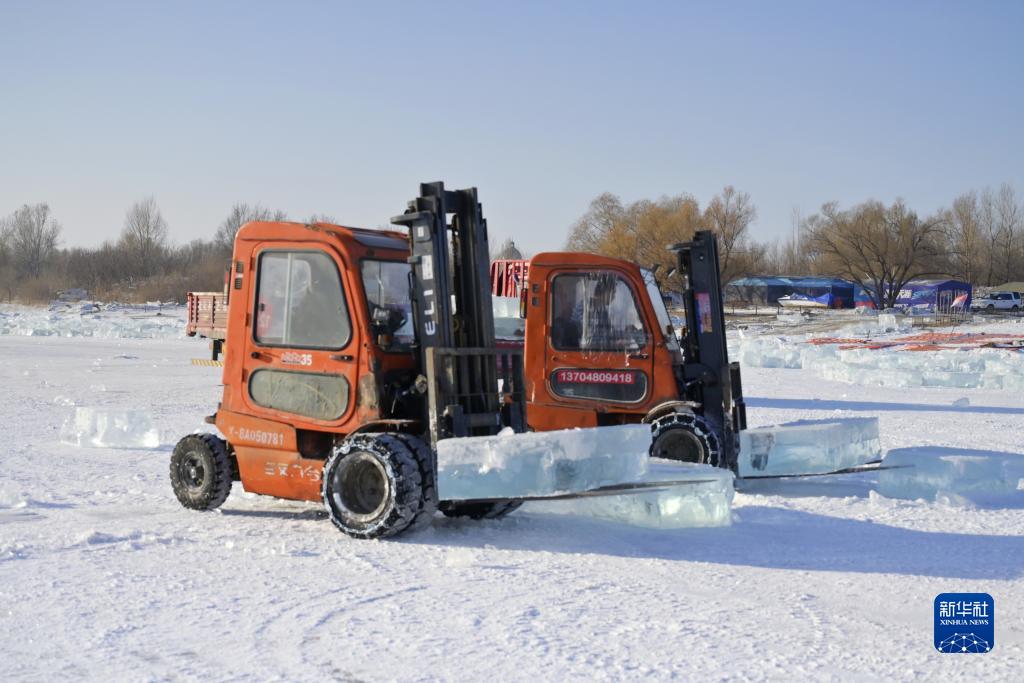 眼下,第二十五屆哈爾濱冰雪大世界採冰工作已全面展開。在封凍的松花江哈爾濱段江面,採冰工人肩扛手拉,從封凍的松花江裏採出一塊塊晶瑩剔透的冰塊,運冰車、叉車、鏟車在江畔往來穿梭,呈現一派熱火朝天的繁忙景象。
