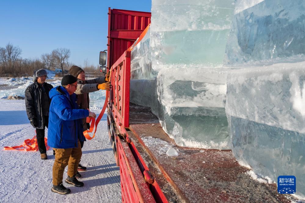 眼下,第二十五屆哈爾濱冰雪大世界採冰工作已全面展開。在封凍的松花江哈爾濱段江面,採冰工人肩扛手拉,從封凍的松花江裏採出一塊塊晶瑩剔透的冰塊,運冰車、叉車、鏟車在江畔往來穿梭,呈現一派熱火朝天的繁忙景象。