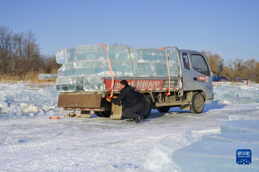 12月14日,工人將成捆的冰塊固定在運冰車上。