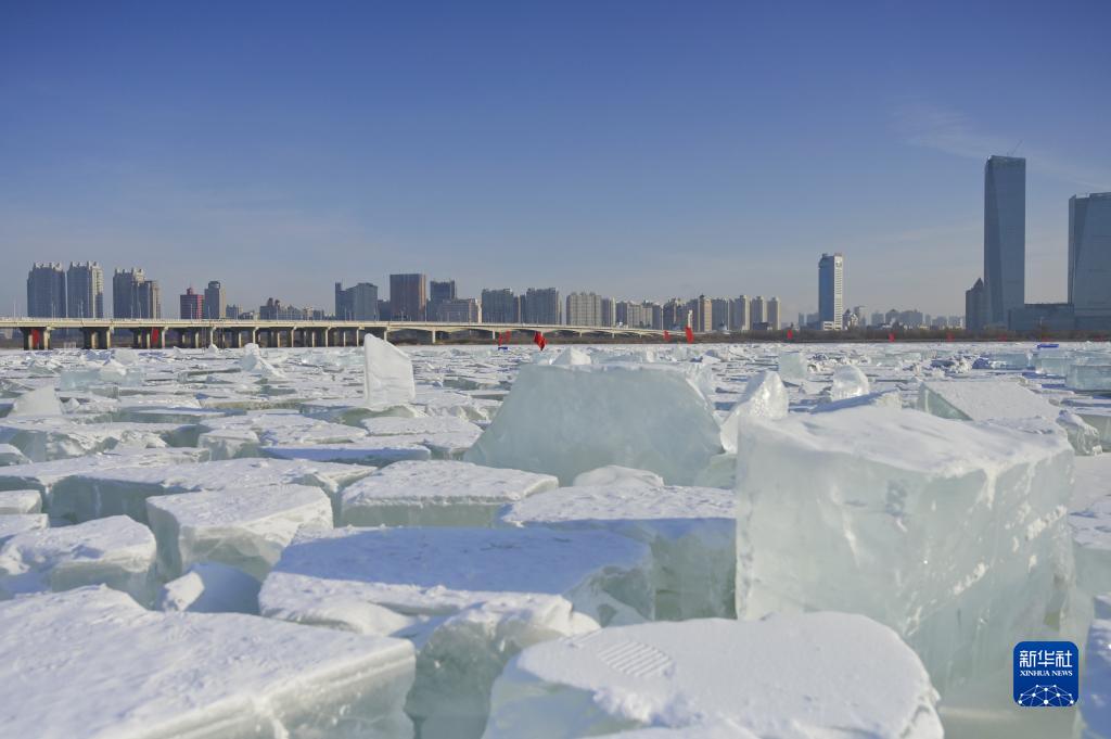 眼下,第二十五屆哈爾濱冰雪大世界採冰工作已全面展開。在封凍的松花江哈爾濱段江面,採冰工人肩扛手拉,從封凍的松花江裏採出一塊塊晶瑩剔透的冰塊,運冰車、叉車、鏟車在江畔往來穿梭,呈現一派熱火朝天的繁忙景象。