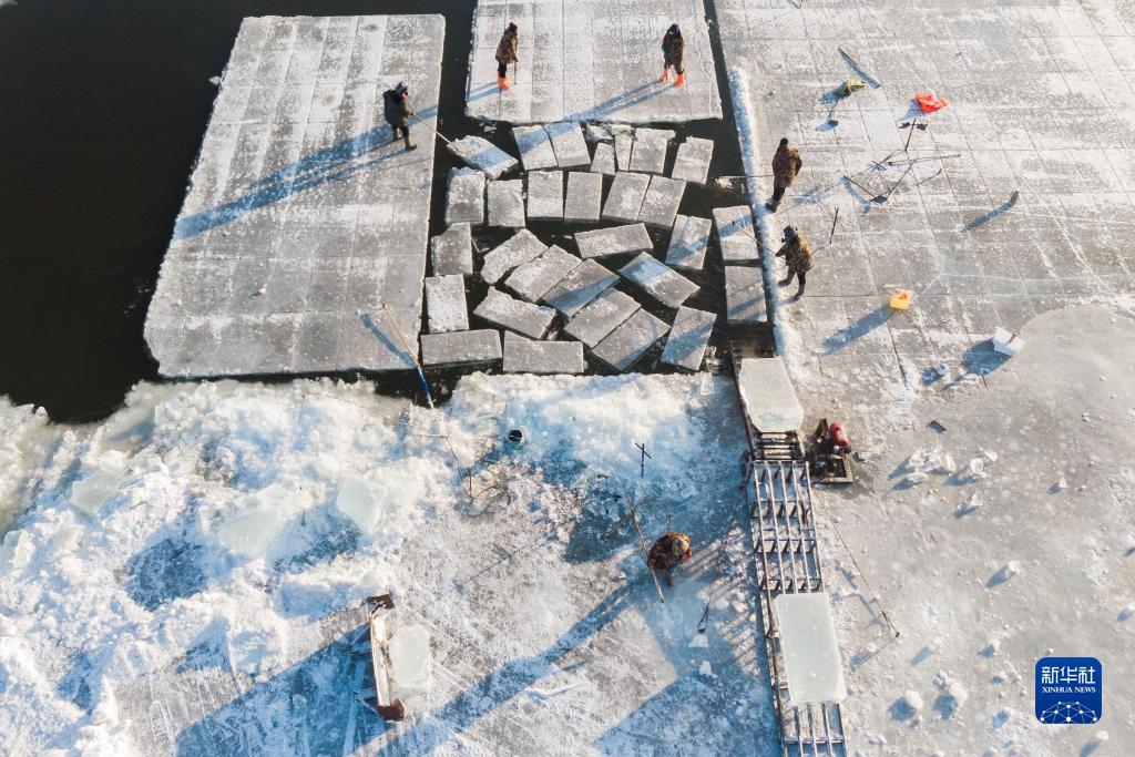 12月14日,在封凍的松花江哈爾濱段江面,採冰工人在進行採冰作業(無人機照片)。