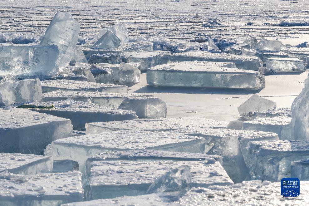 這是12月14日拍攝的松花江哈爾濱段江畔被採上岸的冰塊。