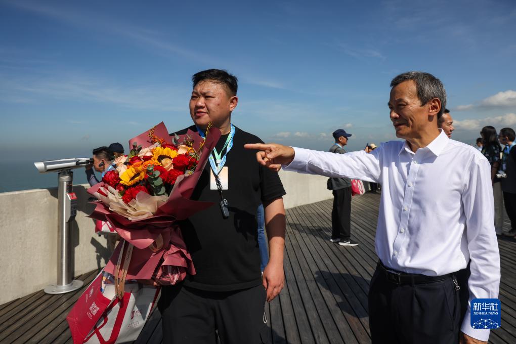 12月15日,來自北京的張岩(左)成為首位登上港珠澳大橋東人工島的游客,港珠澳大橋管理局局長鄭順潮(右)向他介紹大橋情況。