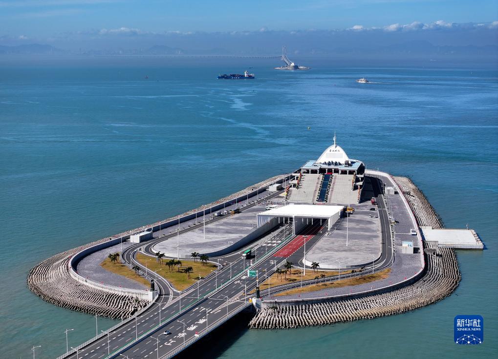 港珠澳大橋東人工島和西人工島遙相呼應(12月15日攝,無人機照片)。