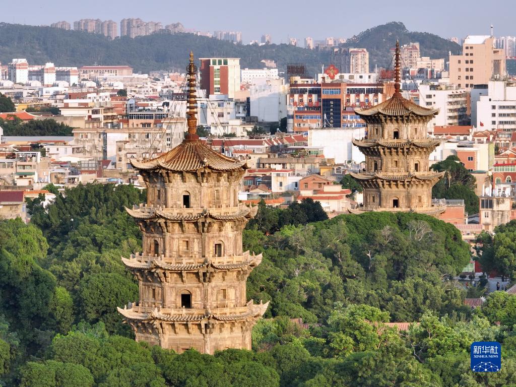 泉州開元寺及東西塔(無人機照片,11月7日攝)。開元寺位於泉州西街東段,始建於唐垂拱二年(686年)。東西塔是開元寺的重要文物,也是泉州古城的標誌。開元寺內多元文化遺跡反映出宋元海洋貿易帶給泉州的經濟繁榮和文化共存特徵,是體現世界海洋貿易中心多元社群的代表性遺産。