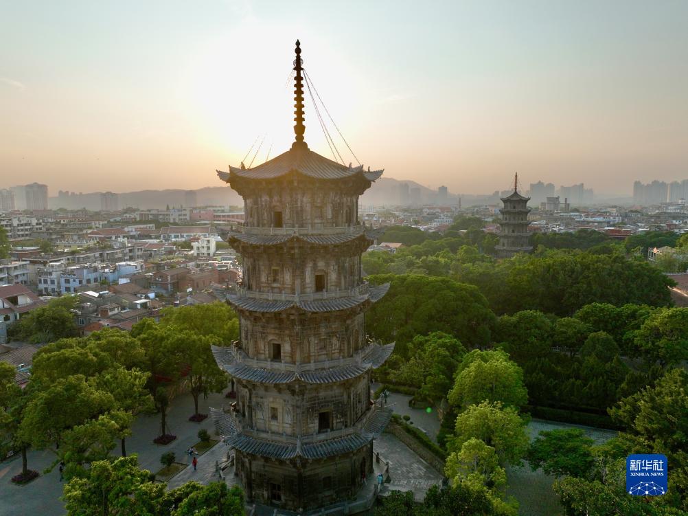 泉州開元寺及東西塔(無人機照片,11月7日攝)。開元寺位於泉州西街東段,始建於唐垂拱二年(686年)。東西塔是開元寺的重要文物,也是泉州古城的標誌。開元寺內多元文化遺跡反映出宋元海洋貿易帶給泉州的經濟繁榮和文化共存特徵,是體現世界海洋貿易中心多元社群的代表性遺産。
