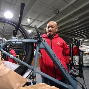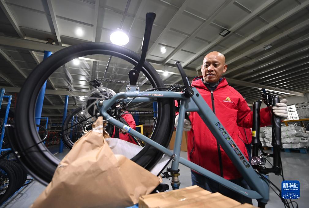 在飛鴿自行車的一處工廠內,工作人員在車間組裝自行車(12月13日攝)。