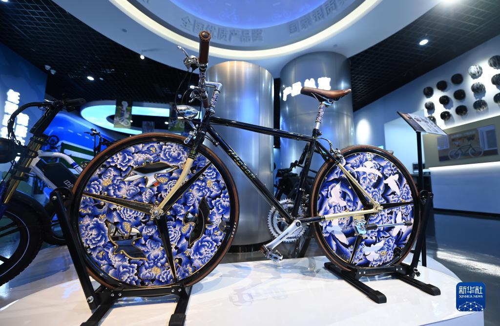 這是12月13日在天津飛鴿品牌文化館內拍攝的融入景泰藍風格的自行車産品。