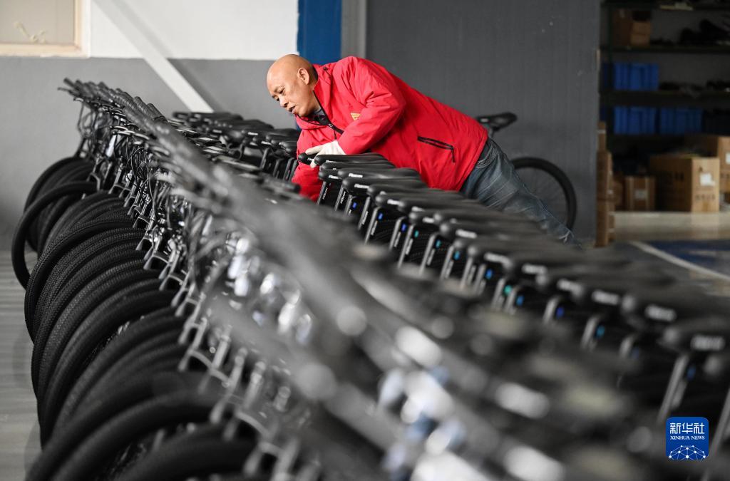 在飛鴿自行車的一處工廠內,工作人員在車間碼放組裝完成的電助力自行車(12月13日攝)。