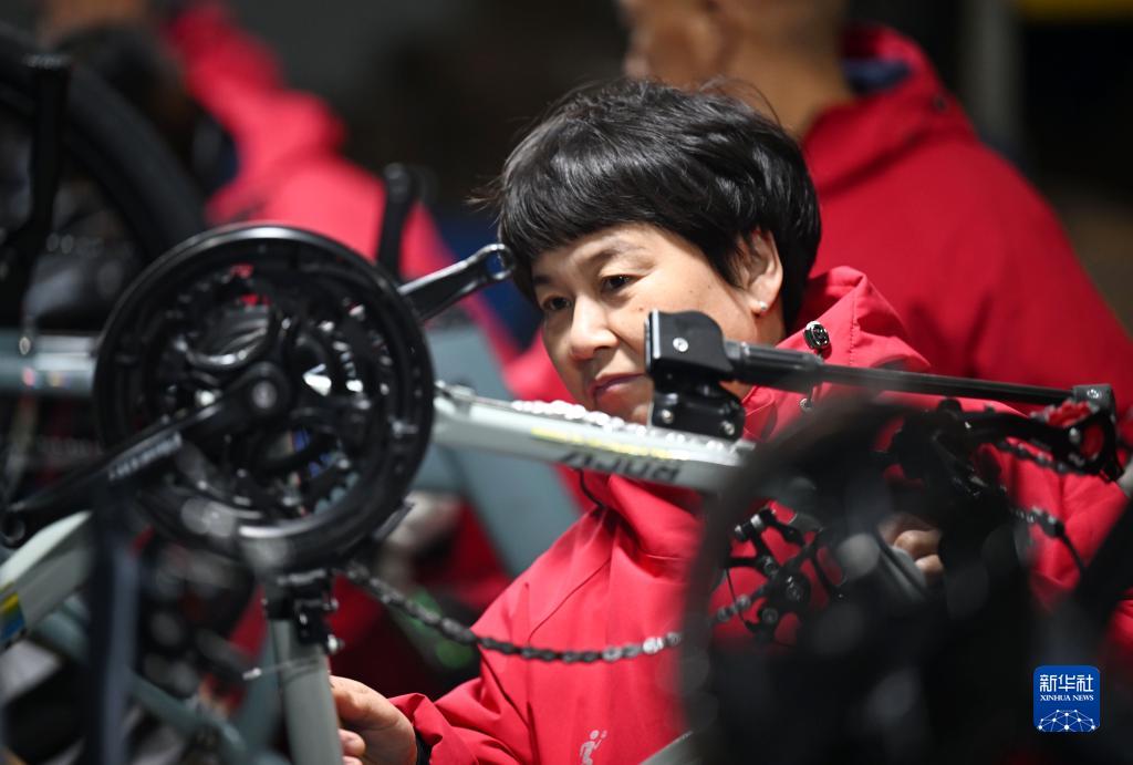 在飛鴿自行車的一處工廠內,工作人員在車間組裝自行車(12月13日攝)。