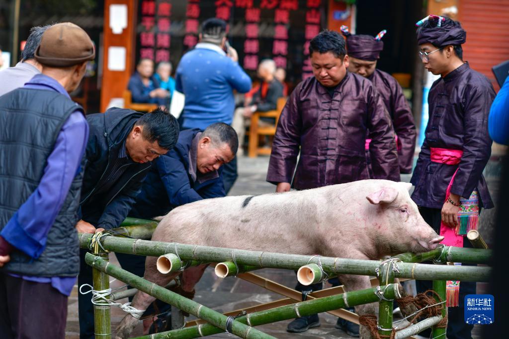 12月15日,在貴州省黎平縣肇興侗寨,侗族群眾在準備年豬。