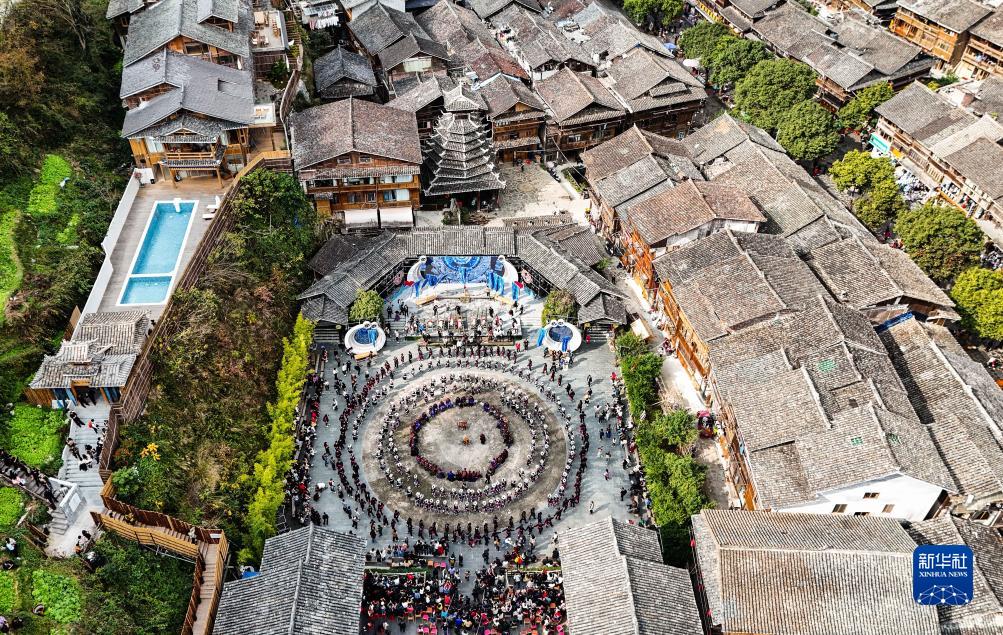 12月15日,在貴州省黎平縣肇興侗寨,侗族群眾身穿節日盛裝參加侗年活動(無人機照片)。