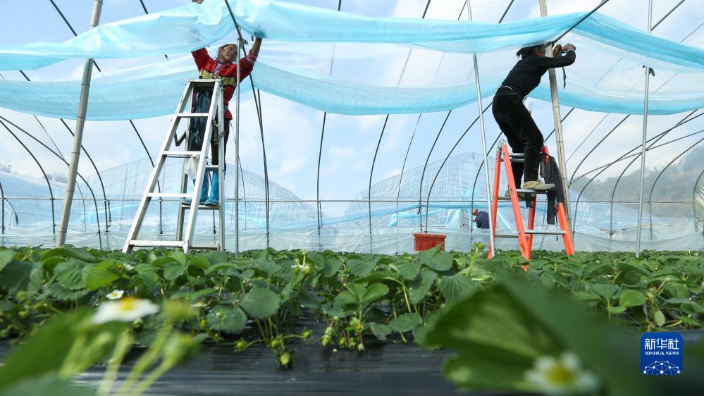 12月15日,在貴州省黔南布依族苗族自治州都勻市勻東鎮大坪村草莓種植基地,農戶加蓋大棚保溫膜,做好抵禦寒潮的準備。