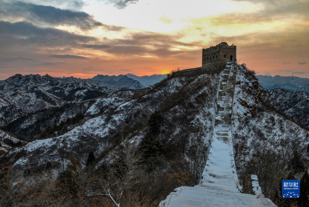 12月15日在河北承德金山嶺長城拍攝的朝霞下的長城雪景。