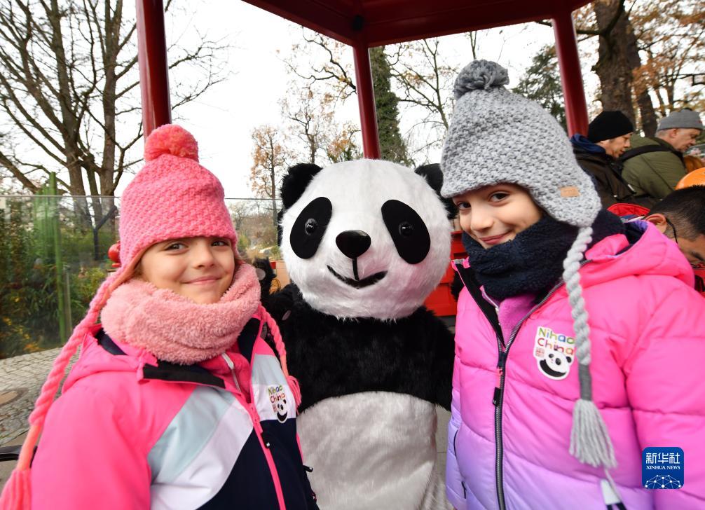 12月8日,在德國柏林動物園,小朋友和大熊貓人偶合影。