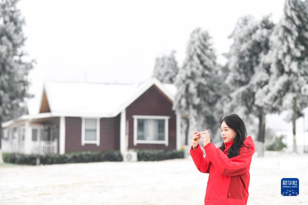 12月16日,一名游客在川河蓋景區拍攝雪後美景。
