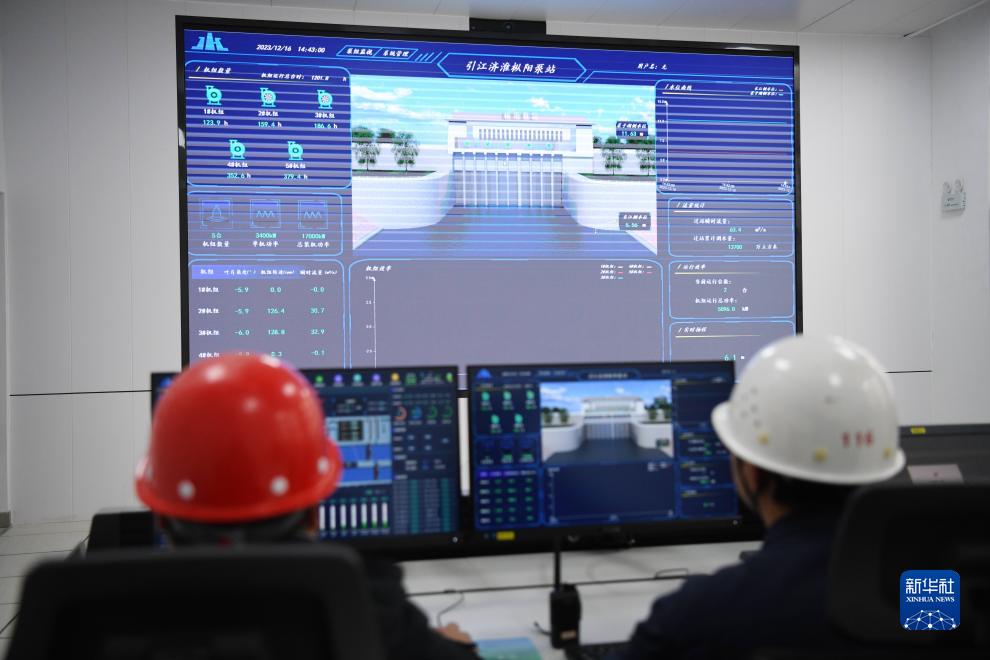 當日,坐落在安徽省南部的引江濟淮樅陽泵站啟動3&&型水泵,中央控制室的大屏幕上顯示,每台水泵正在以每秒約33立方米的流量將長江水引入河道,標誌着引江濟淮一期工程安徽段正式開啟試調水。