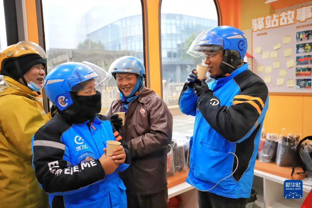12月16日,幾名外賣小哥在位於浙江舟山市的一家“勞動者驛站”裏喝薑茶驅寒。