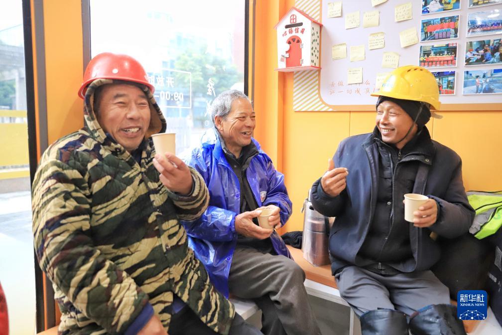 12月16日,幾名戶外勞動者在位於浙江舟山市的一家“勞動者驛站”裏喝薑茶驅寒。