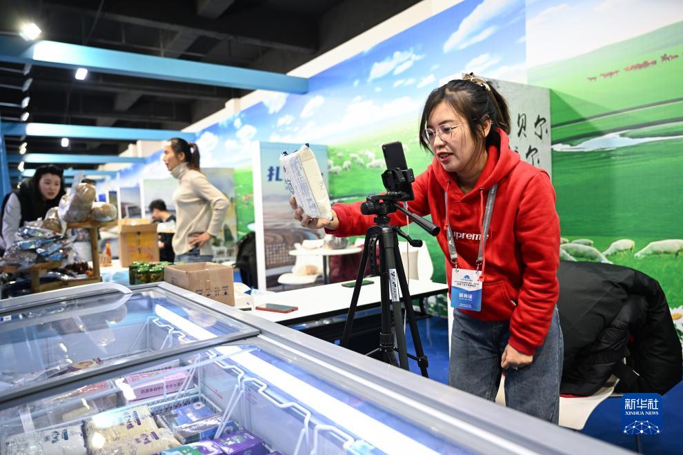 12月16日,參展人員在展銷會上視頻直播特色産品。