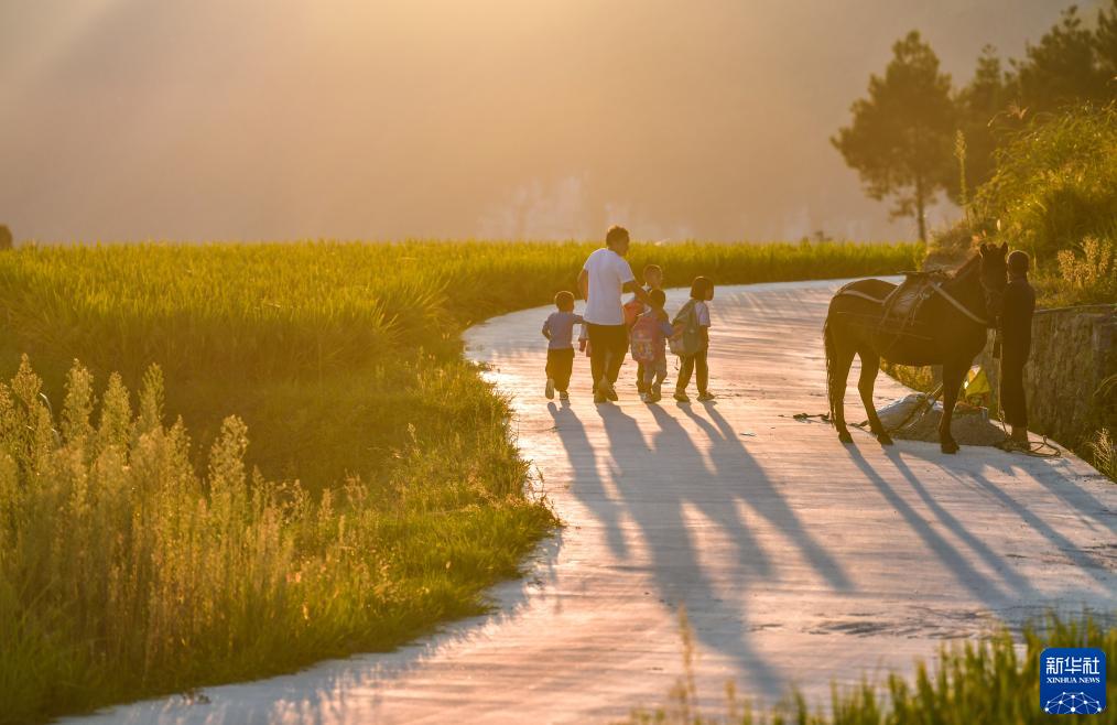 9月6日,貴州省黔南布依族苗族自治州貴定縣沿山鎮岩腳教學點教師陸成文護送學生放學回家。