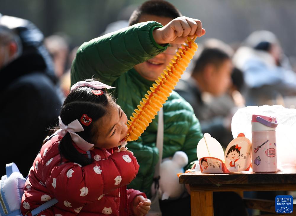1月23日,在四川省成都市街頭,一對父女在享用美食。