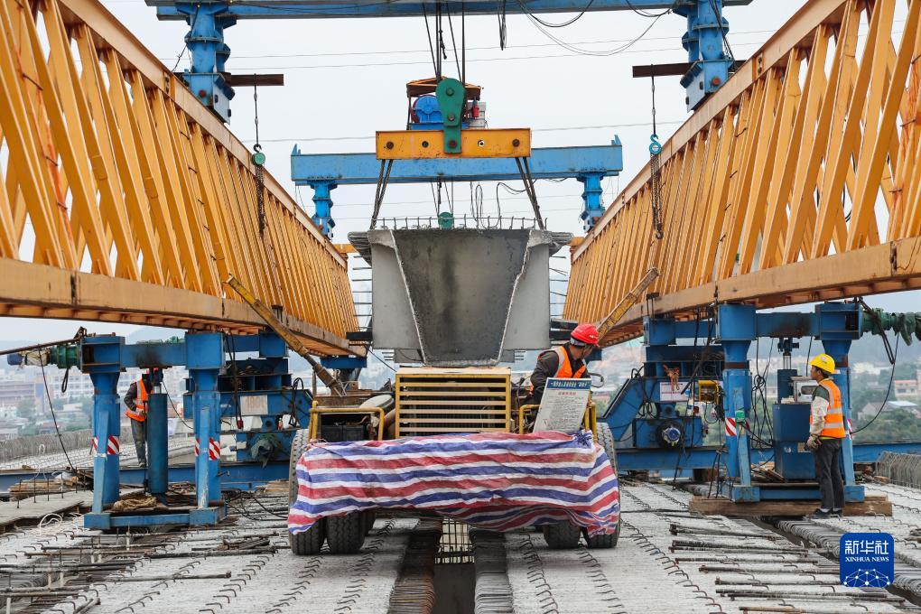 12月17日,施工人員在潭江特大橋運送混凝土箱梁。