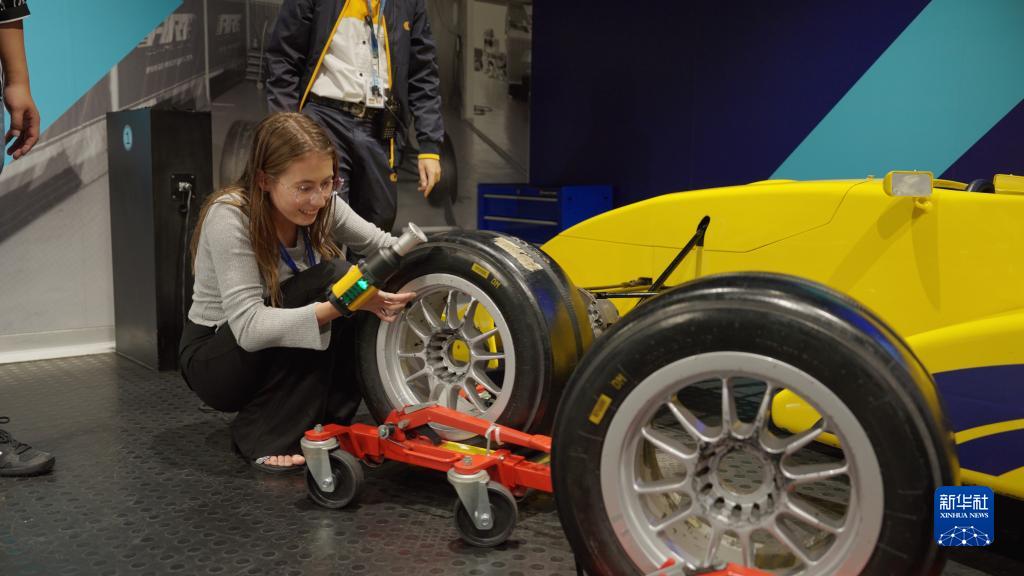 12月16日,參訪團成員卡麗娜體驗給賽車更換輪胎。