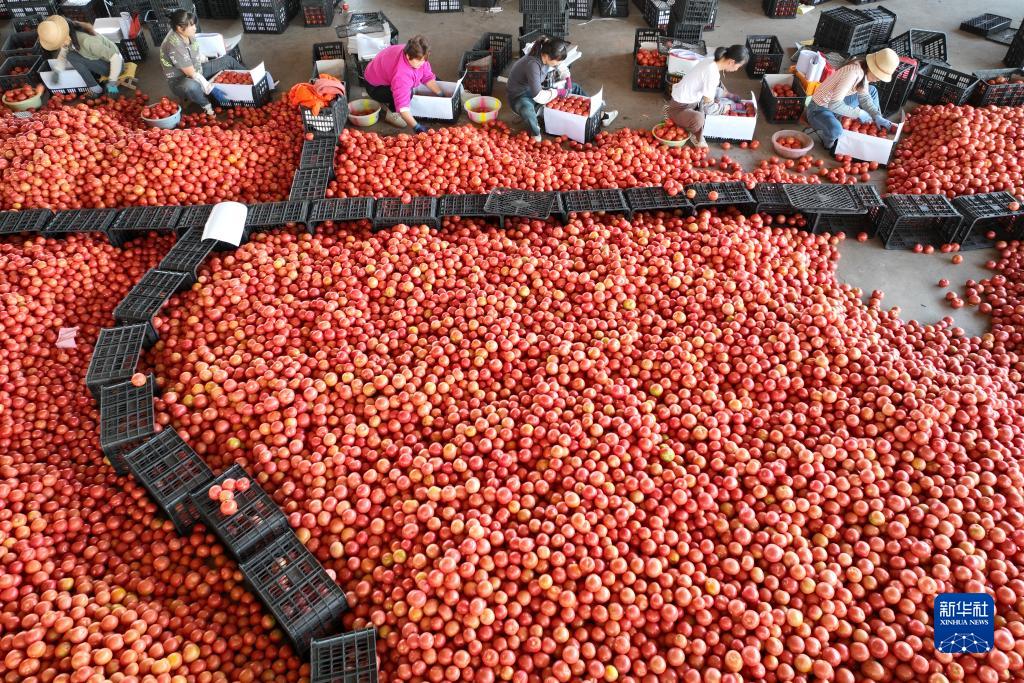 12月17日,雲南省元謀縣元謀蔬菜批發市場內,工人將西紅柿裝箱外運(無人機照片)。