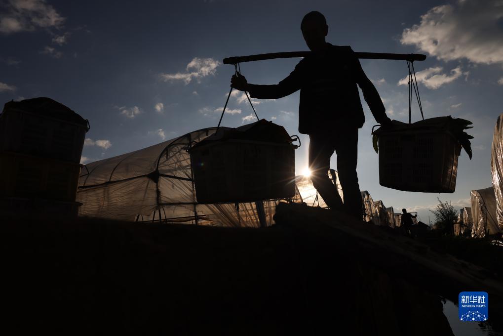 12月17日,在雲南省昆明市呈貢區可樂村,村民在挑運蔬菜。