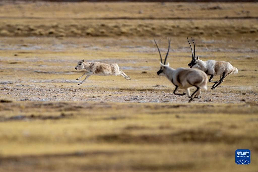 在羌塘國家級自然保護區,兩隻雄性藏羚羊在追逐雌性(12月16日攝)。