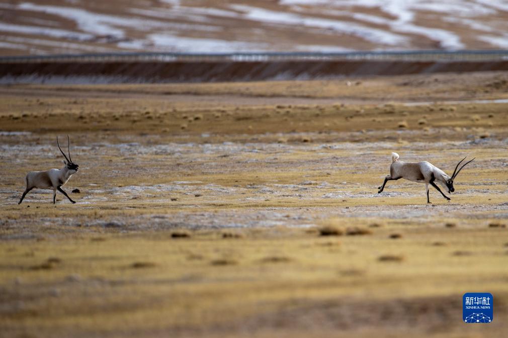 在羌塘國家級自然保護區,兩隻雄性藏羚羊為爭奪交配權而相互追逐(12月16日攝)。