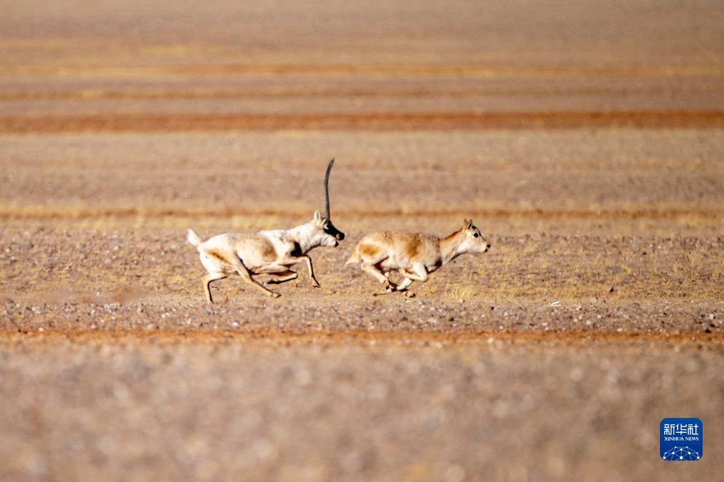 在羌塘國家級自然保護區,一隻雄性藏羚羊在追逐雌性尋求交配(12月17日攝)。