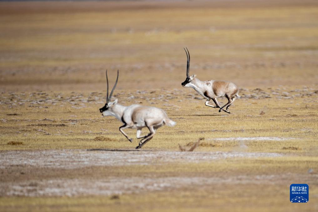 在羌塘國家級自然保護區,兩隻雄性藏羚羊為爭奪交配權而相互追逐(12月16日攝)。