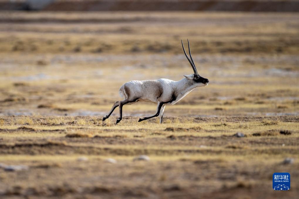 在羌塘國家級自然保護區,一隻雄性藏羚羊在奔跑(12月16日攝)。