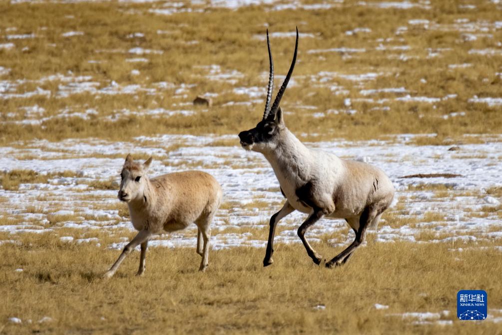 在羌塘國家級自然保護區,一隻雄性藏羚羊在追逐雌性尋求交配(12月16日攝)。