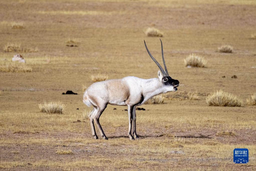在羌塘國家級自然保護區,一隻發情的雄性藏羚羊在“呼喚”雌性(12月16日攝)。