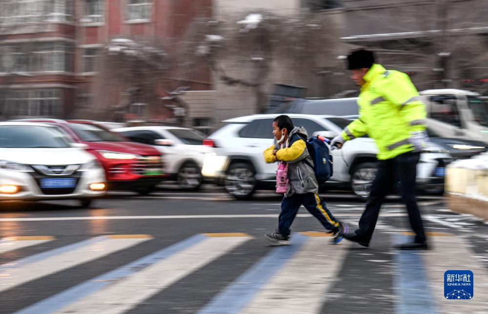 12月18日,烏魯木齊市公安局交警支隊水磨溝區大隊民警護送小朋友安全通過馬路入校。