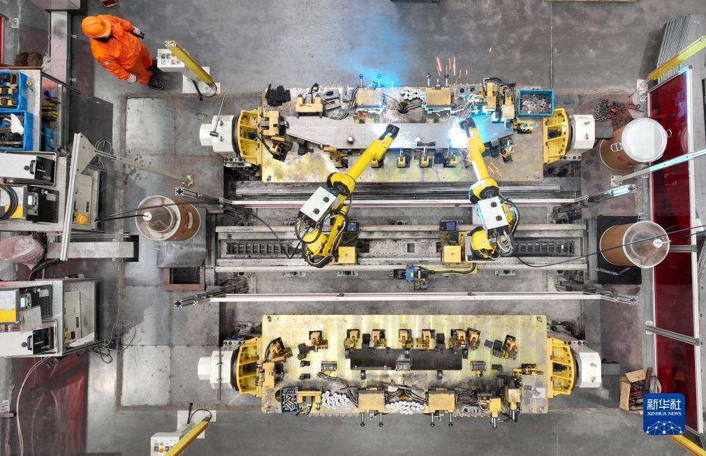 12月18日,在浙江省湖州市德清縣雷甸鎮一家機械生産企業,工業機器人在焊接車間流水線上作業(無人機照片)。