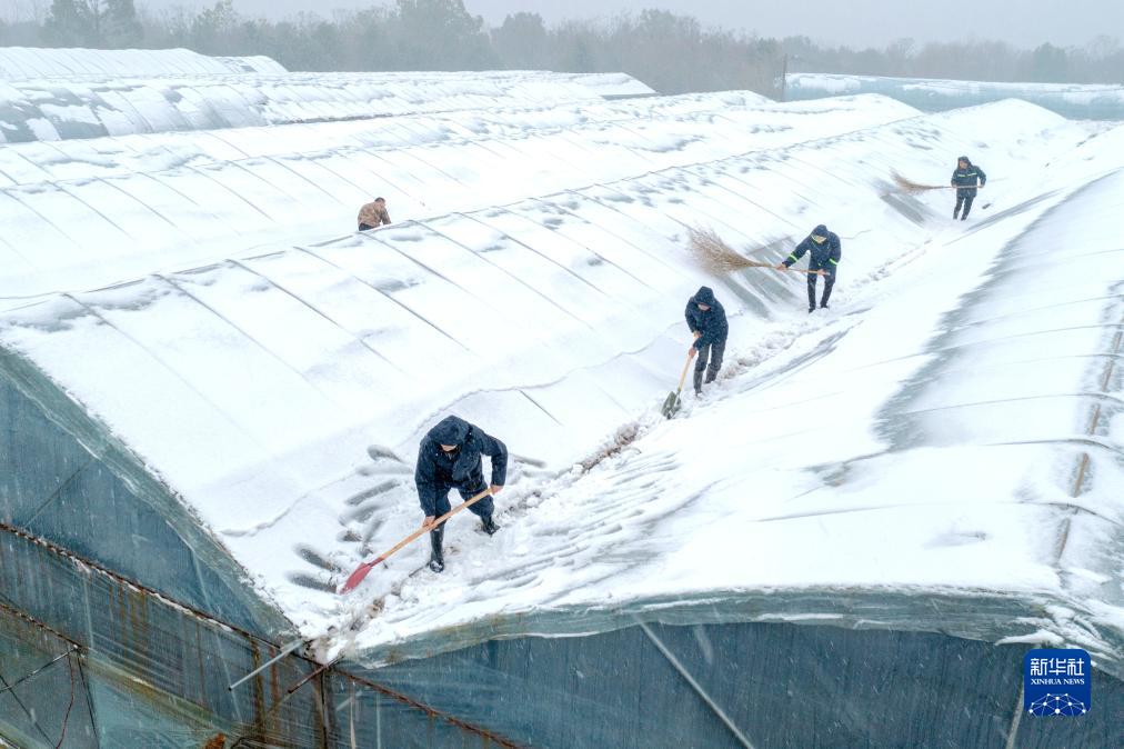 12月18日,在浙江省湖州市長興縣泗安鎮楊灣村一處幫扶基地,黨員志願者和民兵幫助農戶清除大棚上的積雪(無人機照片)。