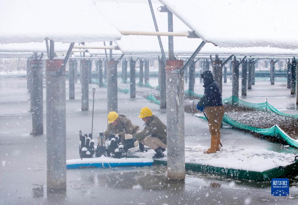 12月18日,國網泰州供電公司金泰陽青年志願者在江蘇省泰州市海陵區華港鎮漁光互補光伏發電基地冒雪為漁民檢修制氧設備(無人機照片)。