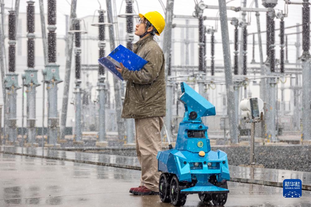 12月18日,國網泰州供電公司運行人員輔助機器人對變電站進行冒雪巡視。