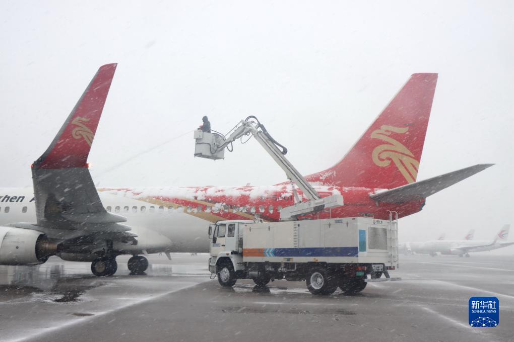 12月18日,江蘇常州國際機場的工作人員為即將起飛的航班噴灑融雪劑。