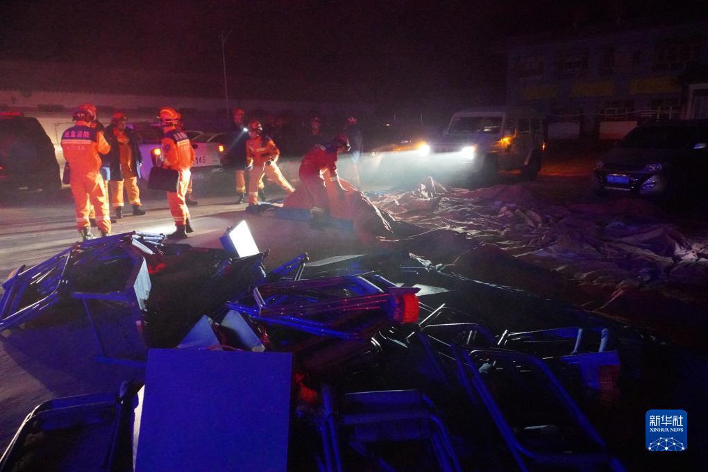 12月19日凌晨,在甘肅省臨夏回族自治州積石山保安族東鄉族撒拉族自治縣大河家鎮陳家村,救援力量在現場整頓物資開展救援。