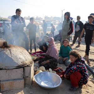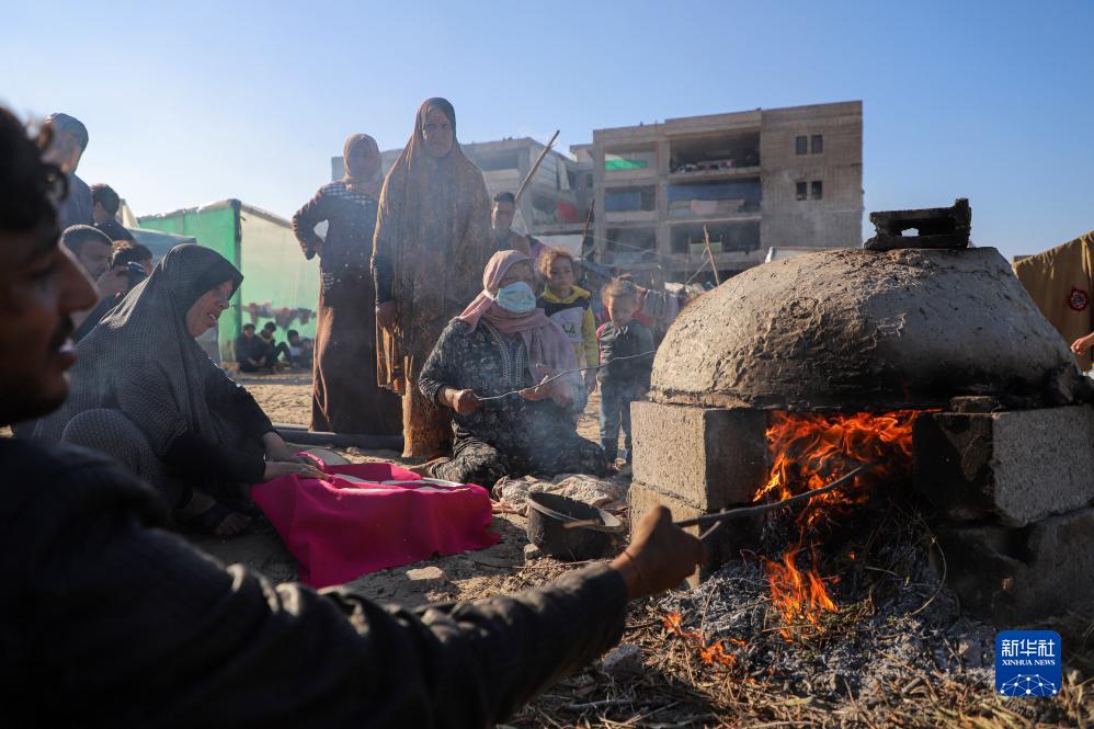 12月18日,在加沙地帶南部城市拉法,人們在臨時避難所準備食物。