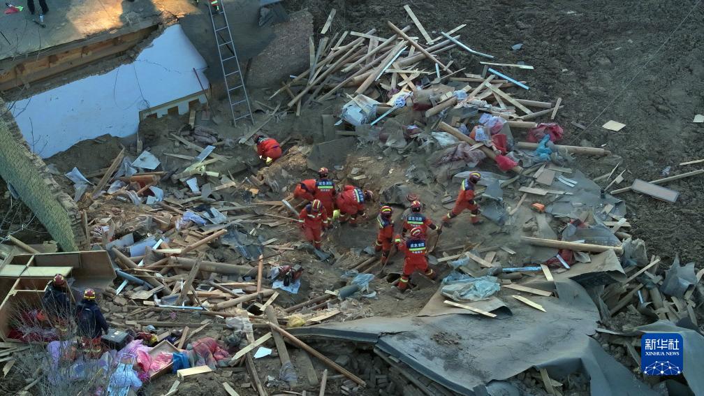 12月19日,在青海省海東市民和回族土族自治縣中川鄉草灘村,海東市消防救援支隊隊員在搜救(無人機照片)。