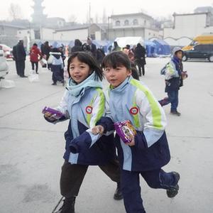 12月19日,在甘肅省臨夏回族自治州積石山保安族東鄉族撒拉族自治縣大河家鎮大河村,村民在領取早餐。