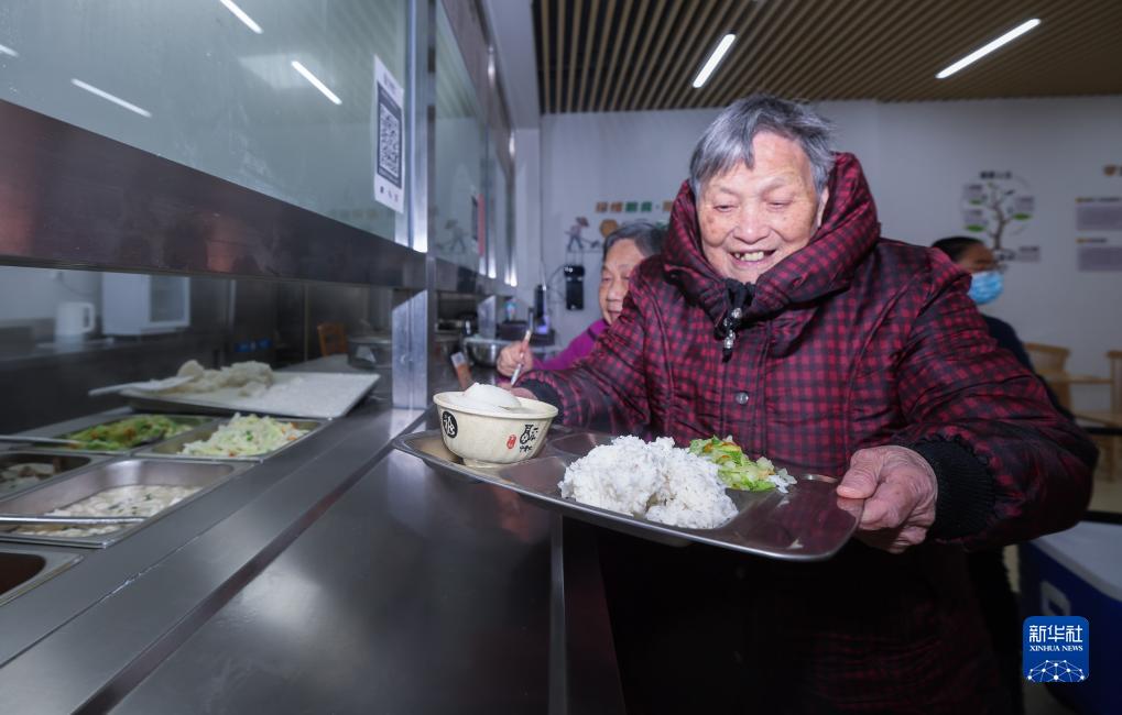 12月19日,在金華市婺城區新獅街道柳湖花園社區居家養老服務照料中心餐廳,老人們在取餐。