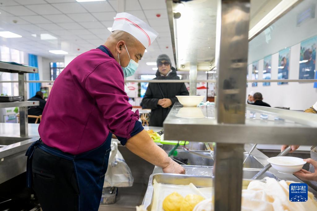 12月19日,工作人員在回民區奔騰社區“為老餐廳”給老年人盛飯。