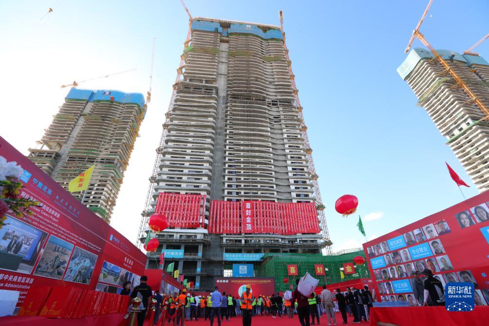 這是12月18日拍攝的埃及阿拉曼新城超高綜合體項目D01住宅樓封頂儀式現場。